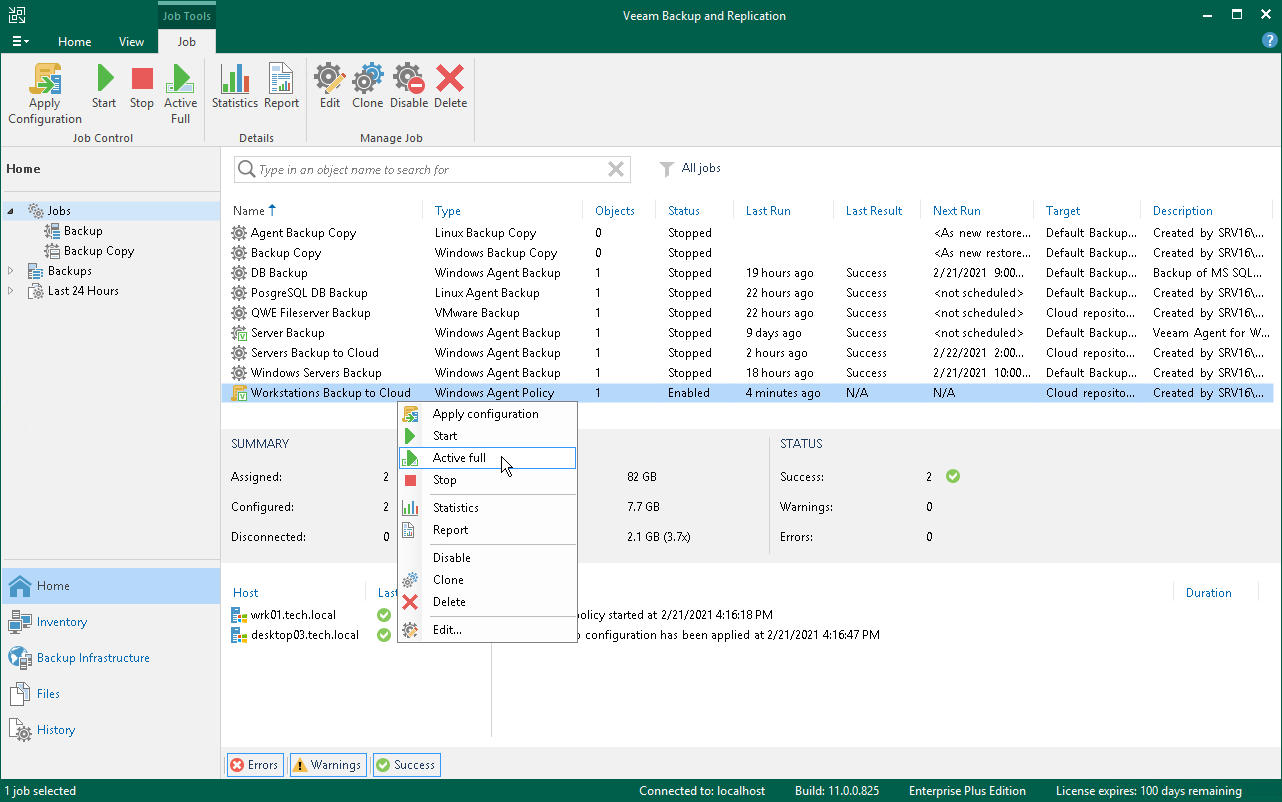 - 作業領域で、該当するバックアップポリシーを選択してリボンの[Active Full]をクリックするか、ジョブを右クリックして[Active Full]を選択します。
