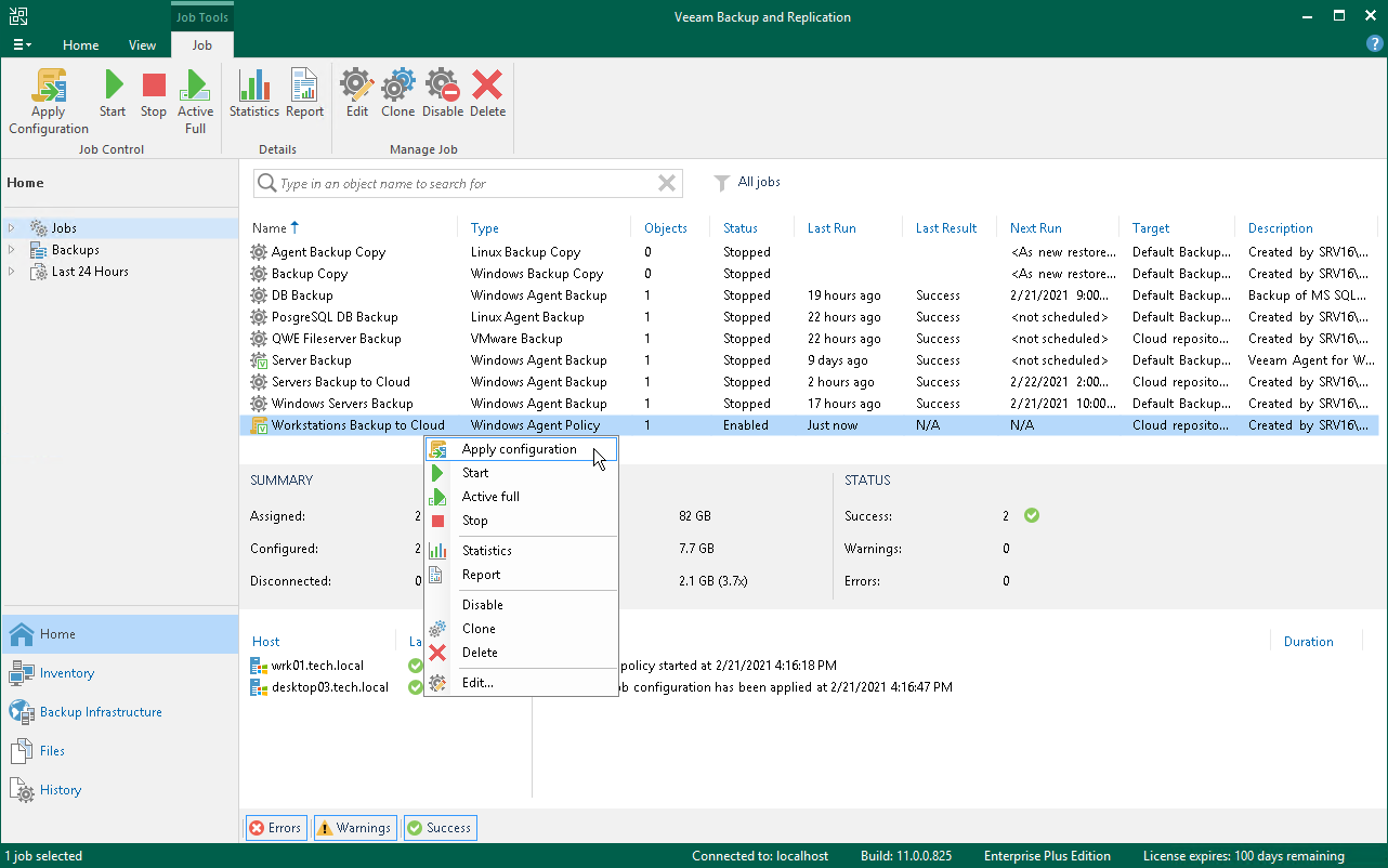 - 作業領域で、バックアップポリシーを選択してリボン上の[Apply Configuration]をクリックするか、ポリシーを右クリックして[Apply configuration]を選択します。