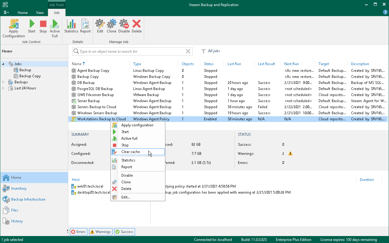 バックアップポリシーに追加されているVeeam Agentコンピューター上でバックアップキャッシュをクリアするには、次の手順を実行します。