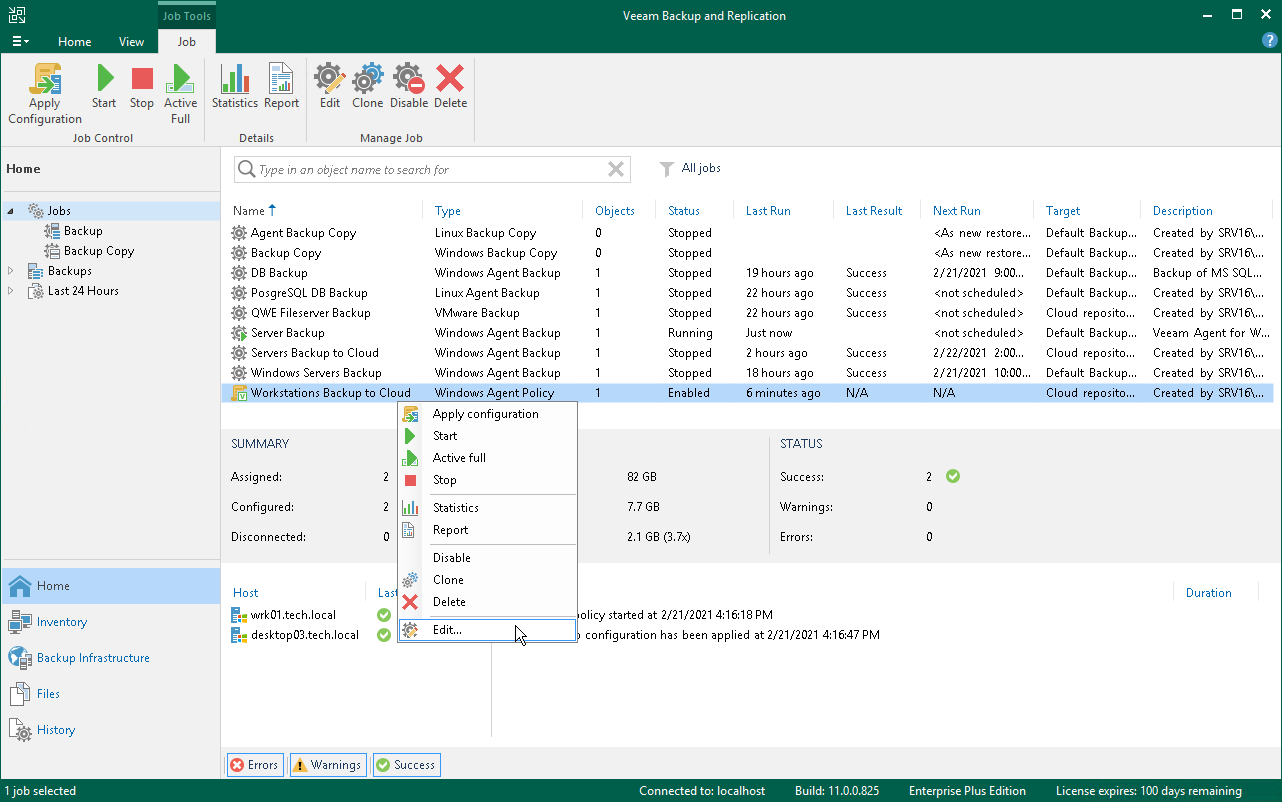 Veeam Agentバックアップポリシーの設定はいつでも編集できます。たとえば、保護対象コンピューター上で実行されているVeeam Agentバックアップジョブについて、バックアップ範囲、保存場所、またはスケジュール設定を変更できます。バックアップポリシーの設定を変更すると、Veeam Backup & Replicationにより、指定した設定が、ポリシーに追加された保護対象コンピューター上で構成されているVeeam Agentバックアップジョブに適用されます。