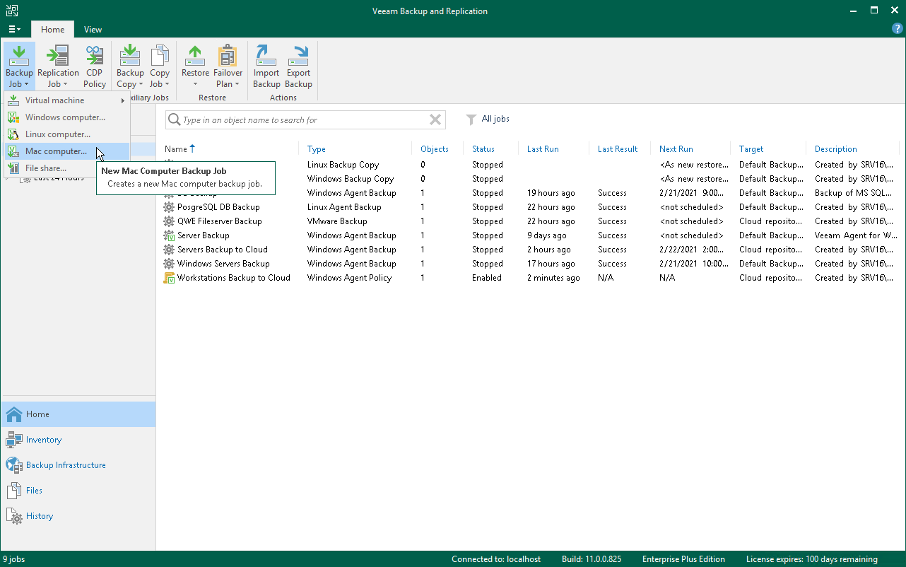 - [Home]ビューを開きます。[Jobs]ノードを選択し、リボンで[Backup Job] > [Mac computer]の順にクリックします。