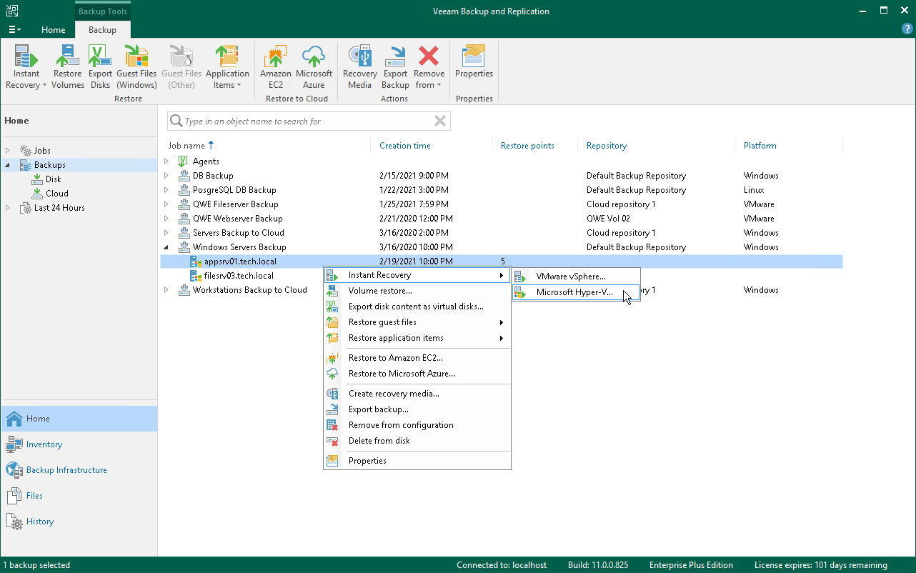 Veeam Backup & Replicationコンソールを使用して、ご使用の仮想化環境においてVeeam AgentコンピューターをHyper-V VMとしてリストアできます。Hyper-V VMへのインスタントリカバリでは、Veeam Backup Repository上で作成した、Microsoft Windowsマシンのバックアップを使用できます。Linuxマシンのバックアップや、Veeam Cloud Connectリポジトリ上で作成したバックアップは、この操作には使用できません。