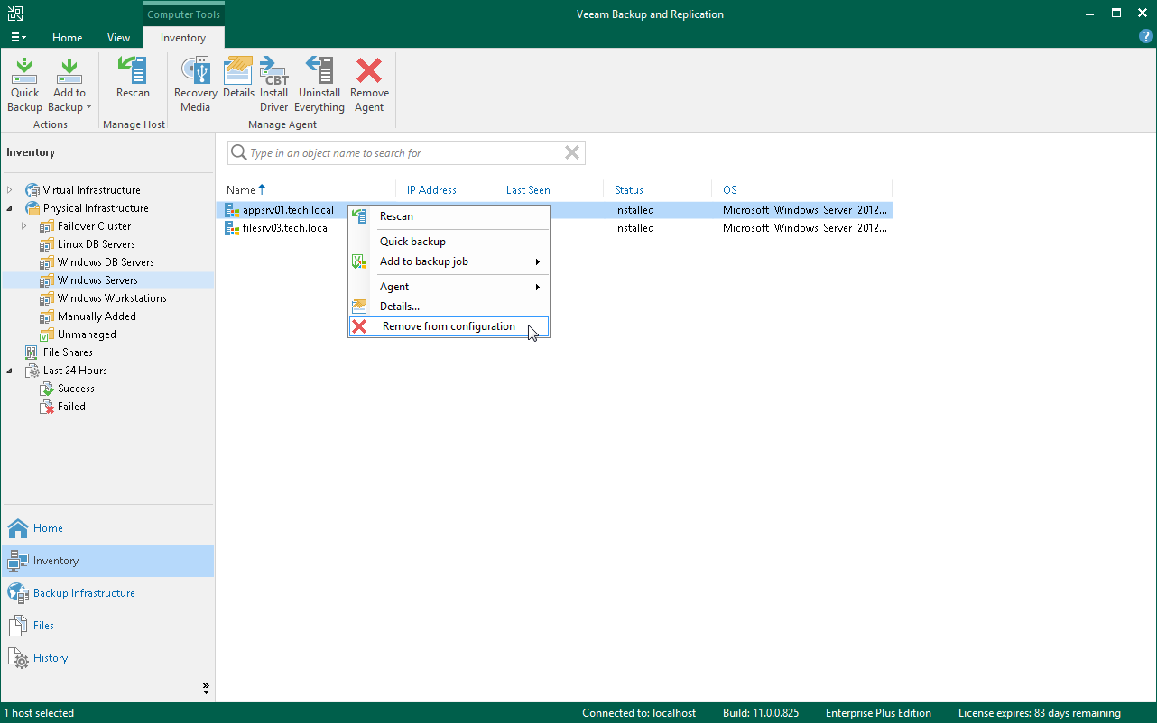 Alternatively, you can remove a computer from a protection group, and then uninstall Veeam Agent from this computer. Keep in mind that in this case you will have to uninstall Veeam Agent using the Microsoft Windows control panel directly on the Veeam Agent computer.