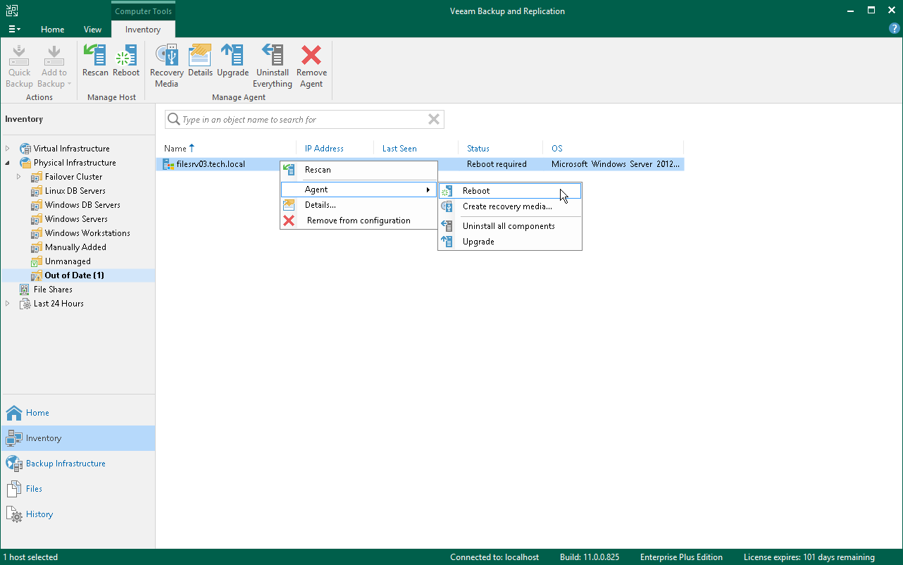 - インベントリペインで、[Physical Infrastructure]ノードを展開し、再起動が必要なコンピューターが含まれている保護グループを選択します。再起動が必要なコンピューターが、Veeam Backup & Replicationコンソールに[Reboot required]ステータスで表示されます。