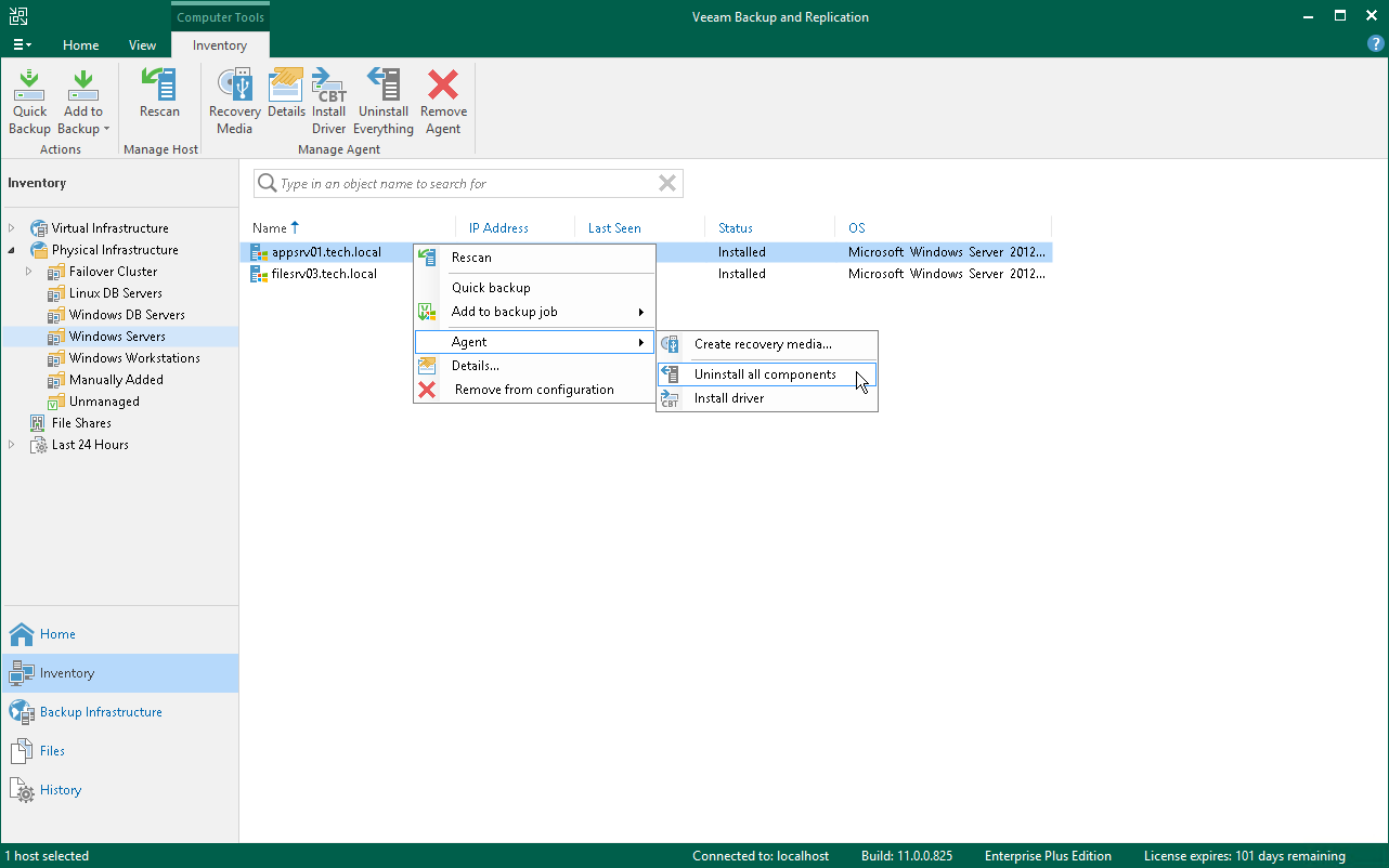 たとえば、保護対象コンピューターで実行されているVeeam Agentを再インストールする場合に、特定の保護対象コンピューターからVeeam Agentを削除できます。保護対象コンピューターからVeeam Agentを削除すると、Veeam Backup & ReplicationによってこのコンピューターからVeeam Installer Serviceも削除されます。