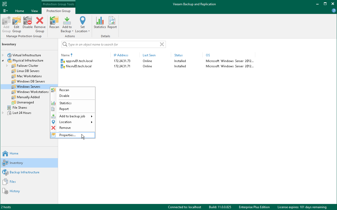 - インベントリペインで、編集する保護グループを選択しリボン上の[Edit Group]をクリックするか、編集する保護グループを右クリックし[Properties]を選択します。