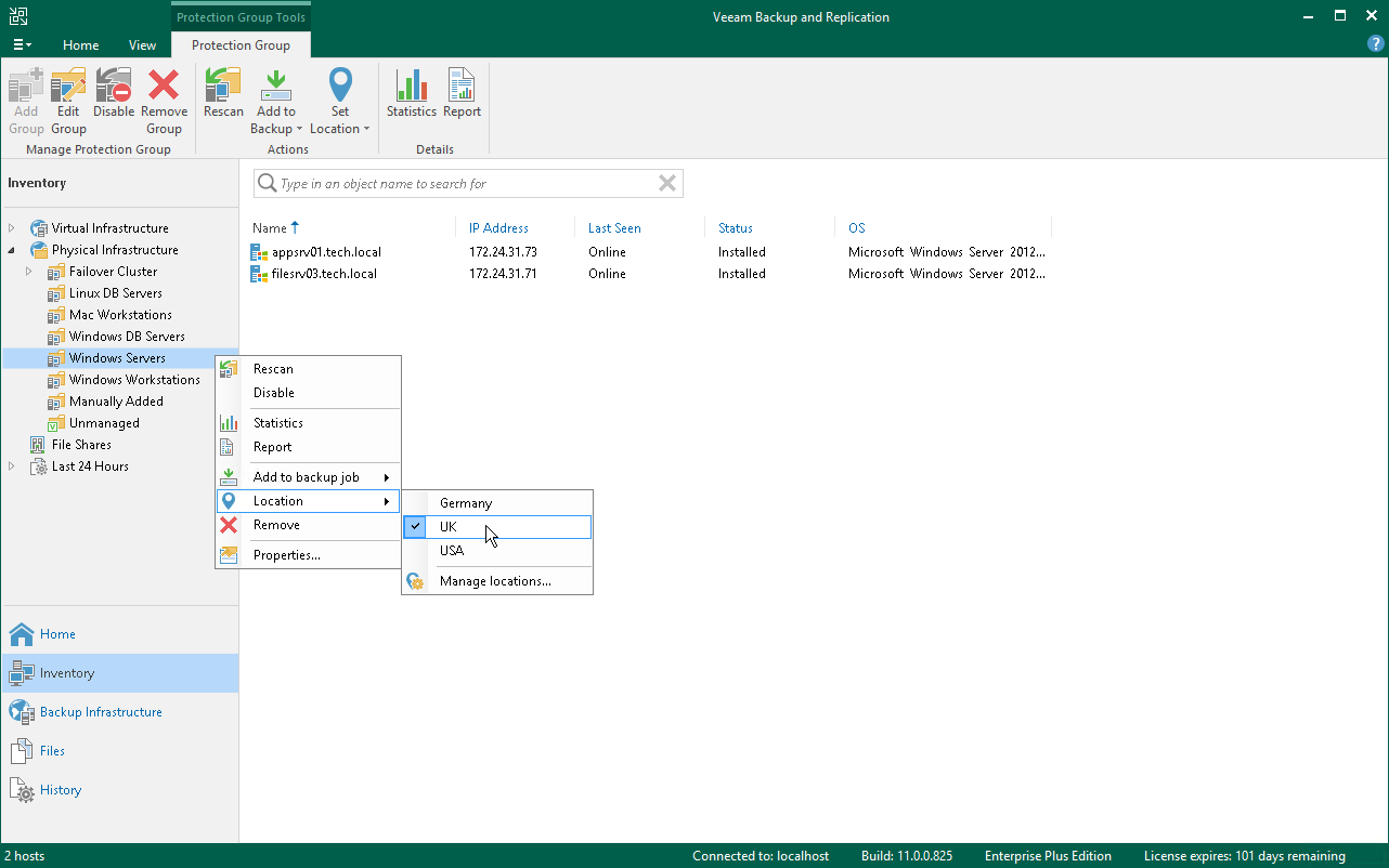 Veeam Backup & Replicationで設定されている保護グループに場所を割り当てることができます。場所を割り当てるには、次の手順を実行します。