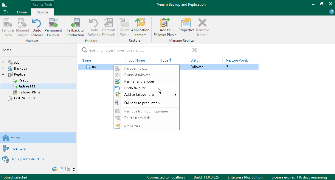 フェイルオーバーの取り消し フェイルオーバーを元に戻すには、次の手順を実行します。Homeビューのインベントリペインで、[Replicas]ノードを選択します。作業領域で、VMレプリカを右クリックし、[Undo Failover]を選択します。開いたウィンドウで、[Yes]をクリックして操作を確認します。参照フェイルオーバーの取り消しの詳細については、以下を参照してください。 フェイルオーバーの取り消し(『Veeam Backup & Replicationユーザーガイド』)。