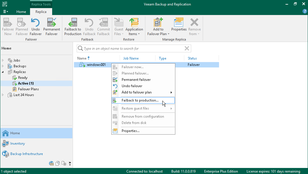 - 作業領域で、VMレプリカを右クリックし、[Failback to production]を選択して、フェイルバックウィザードを起動します。